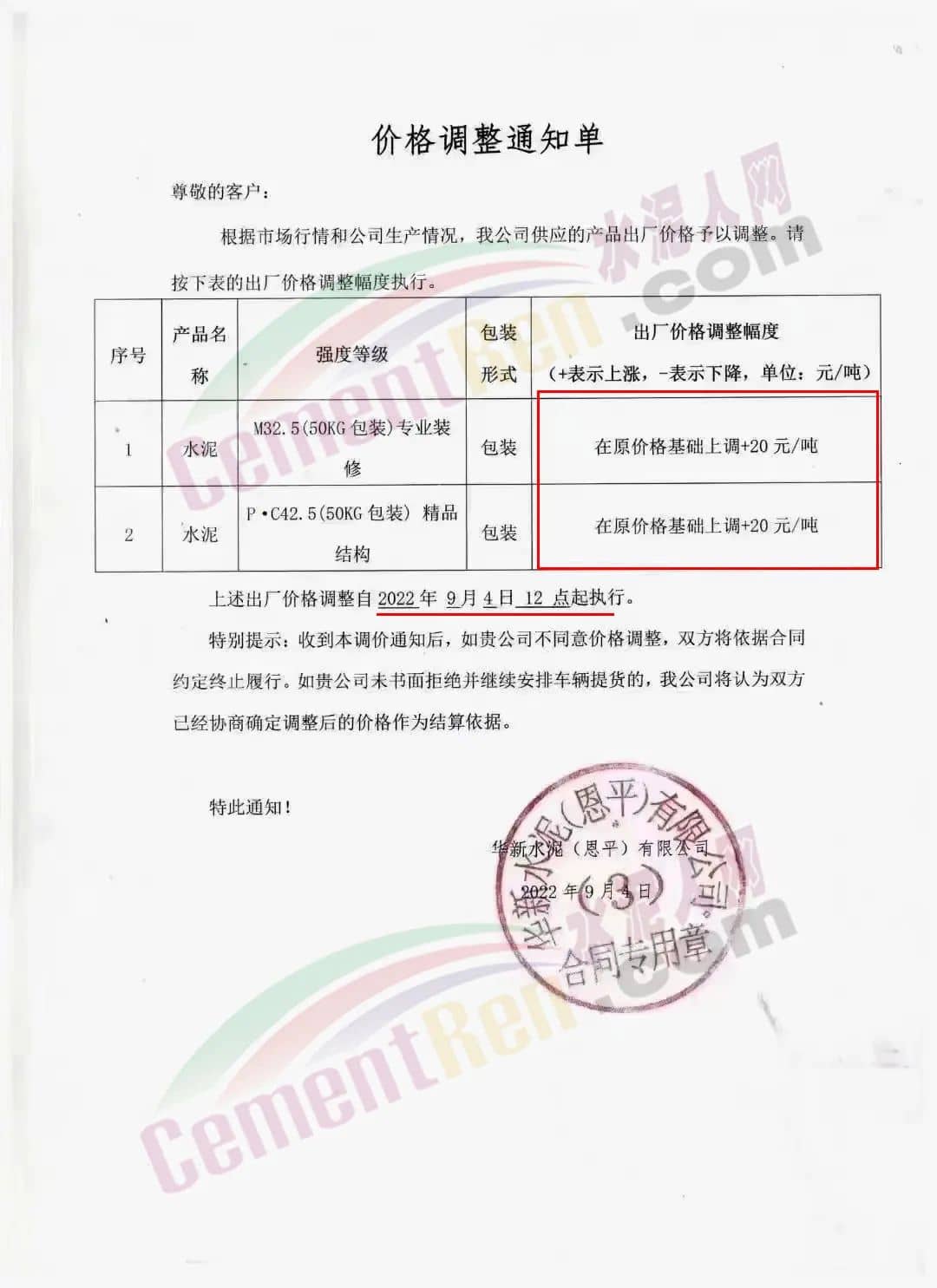 華新水泥(恩平)有限公司通知,自9月4日12點起旗下M32.5包裝專業(yè)裝修、PC42.5包裝精品結構水泥在原價基礎上上調20元/噸。