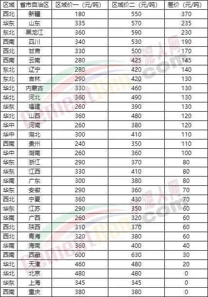 吉林、浙江、安徽、江蘇、云南、遼寧、福建、河南、湖南、廣西、貴州、新疆等12個地區(qū)區(qū)域一價格在300元/噸以下;重慶、黑龍江、河北、山西、寧夏、四川、山東、甘肅、內蒙古、江西、青海、陜西等28個省市自治區(qū)均價在國家統(tǒng)計局公布的流通領域報價384.3元/噸以下。