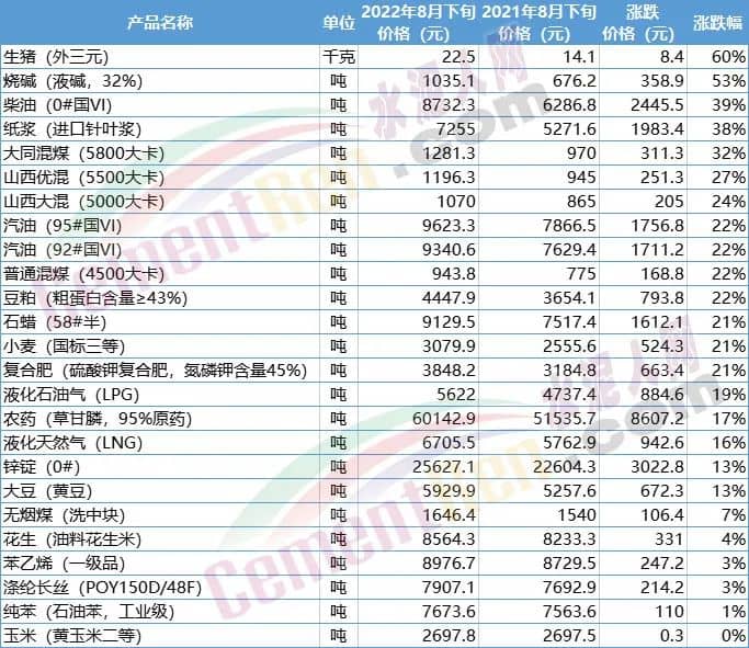 國(guó)家統(tǒng)計(jì)局近期公布的2022年8月下旬流通領(lǐng)域重要生產(chǎn)資料市場(chǎng)價(jià)格變動(dòng)情況顯示,全國(guó)流通領(lǐng)域9大類(lèi)50種重要生產(chǎn)資料市場(chǎng)價(jià)格的監(jiān)測(cè)顯示,2022年8月下旬與8月中旬相比,25種產(chǎn)品價(jià)格上漲。同比上年同期生豬、燒堿、柴油、紙漿、煤炭、汽油、豆粕、石蠟、復(fù)合肥、小麥等14種產(chǎn)品價(jià)格漲幅超過(guò)20%,其中生豬價(jià)格上漲了60%,柴油(0#國(guó)VI)上漲了39%,紙漿(進(jìn)口針葉漿)上漲38%,大同混煤(5800大卡)上漲了32%。