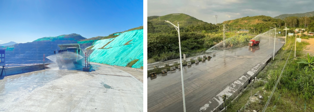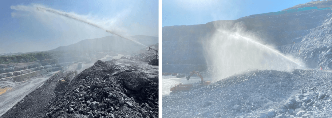 ?、?爆破、裝車、運(yùn)輸:全礦建設(shè)“智慧礦山5G智能噴淋抑塵系統(tǒng)”、“洗車臺”等環(huán)保設(shè)施,裝機(jī)功率450KW,單個(gè)噴槍覆蓋直徑可達(dá)160米,目前礦區(qū)安裝大噴槍20個(gè),礦區(qū)道路安裝小噴槍200個(gè),實(shí)現(xiàn)了2.6平方公里礦區(qū)和6公里運(yùn)礦道路全覆蓋,并采用全球領(lǐng)先的5G系統(tǒng)中央集中控制,日噴淋用水量約1000m³。