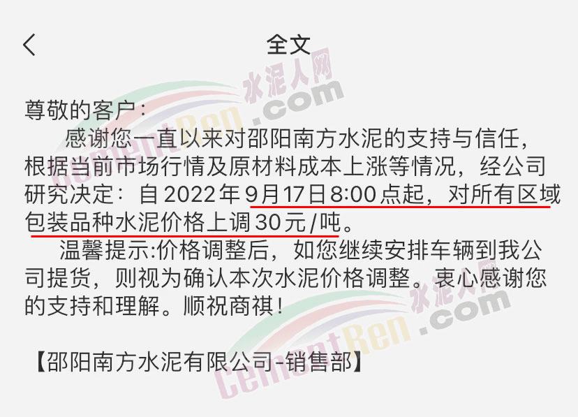 邵陽海螺水泥有限公司銷售部通知,根據(jù)當(dāng)前市場行情及原材料成本上漲等情況,自9月17日8時起,對邵陽縣區(qū)域包裝水泥上調(diào)30元/噸。