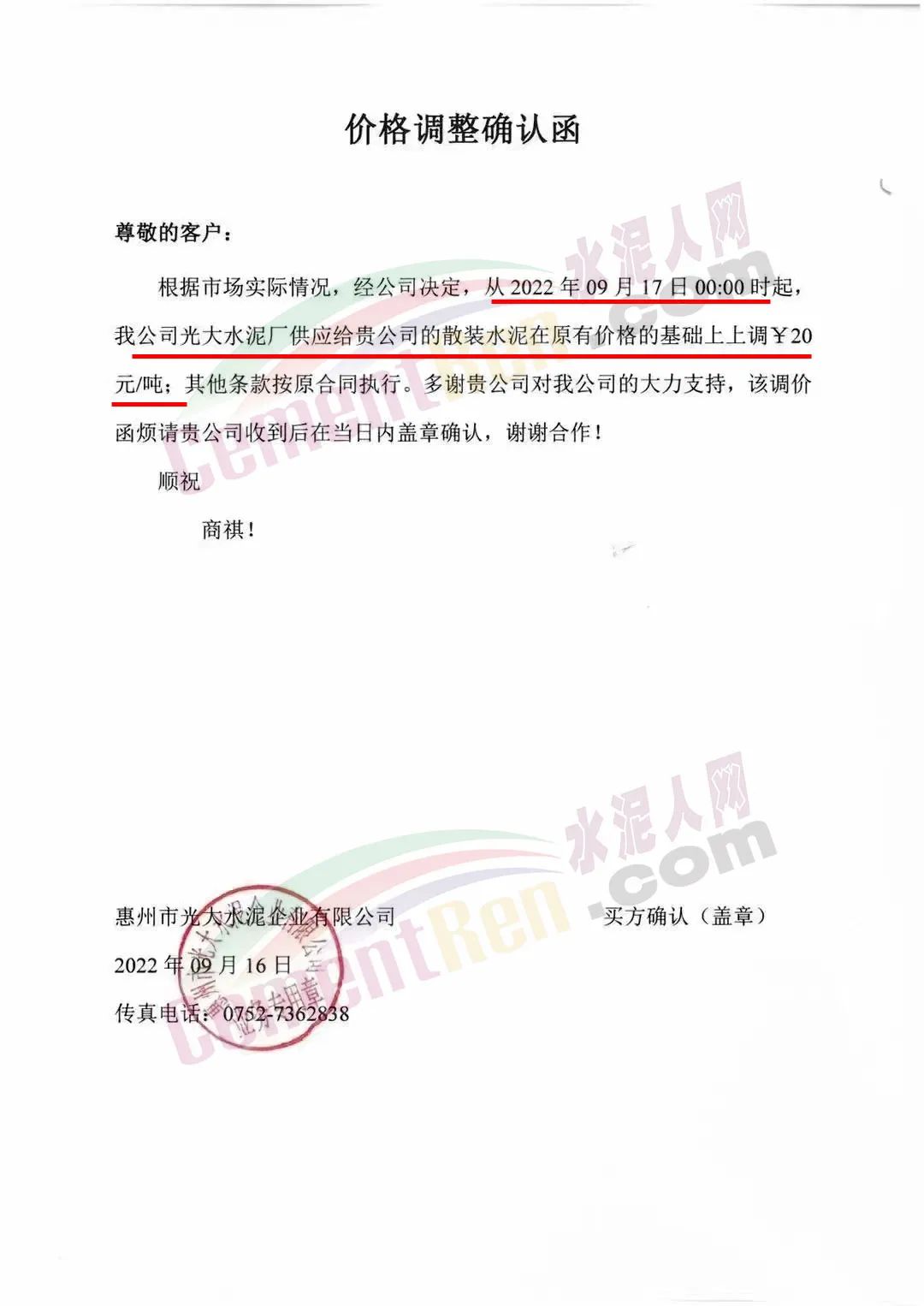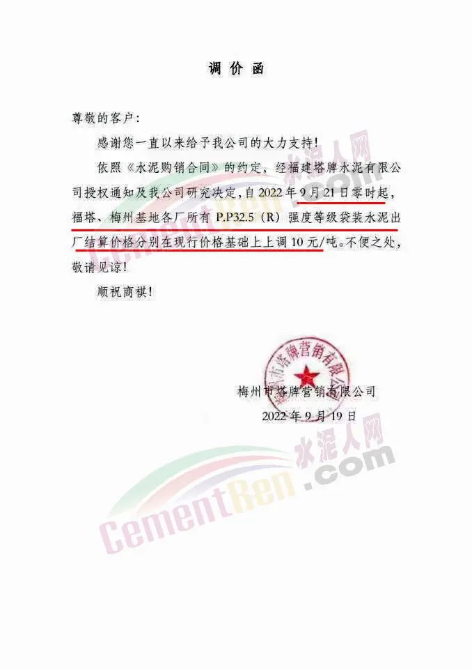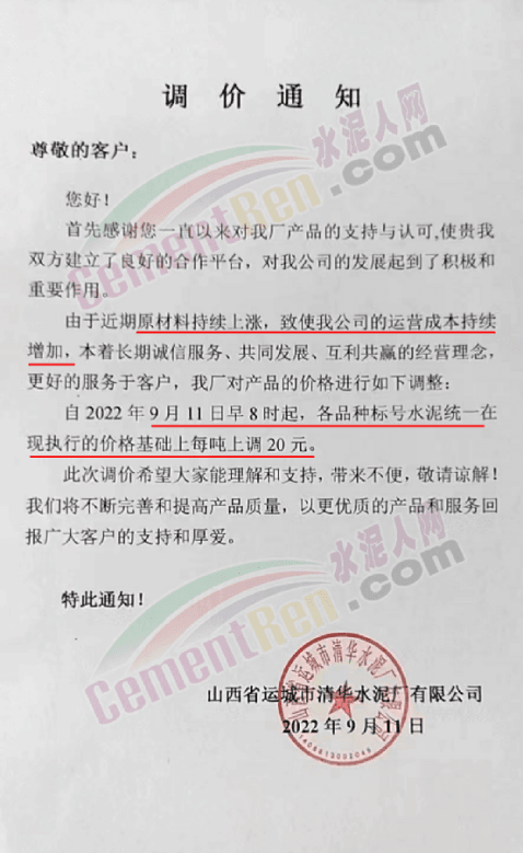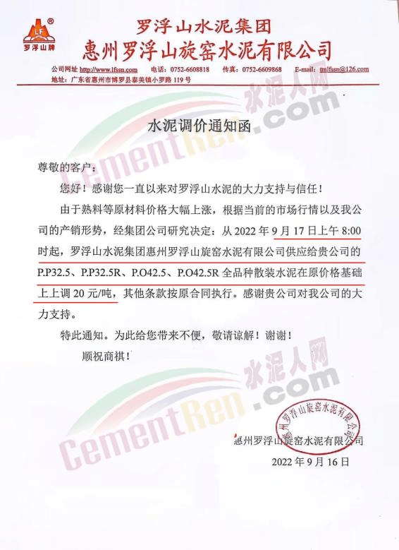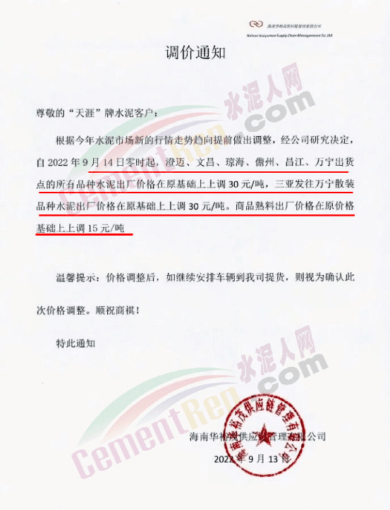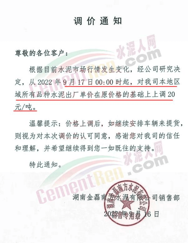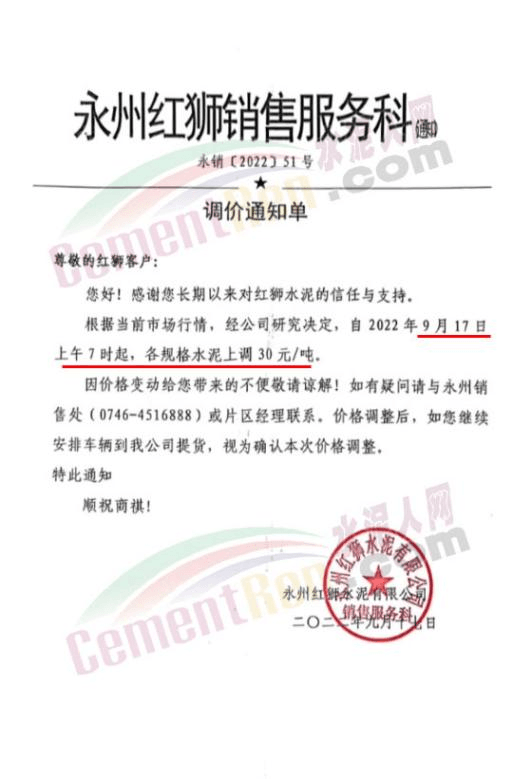 雙峰海螺水泥有限公司通知,根據(jù)當(dāng)前市場行情以及材料成本上漲等情況,經(jīng)公司研究決定,自2022年9月17日800起,對各品種水泥的掛牌出廠價格上調(diào)30元/噸。