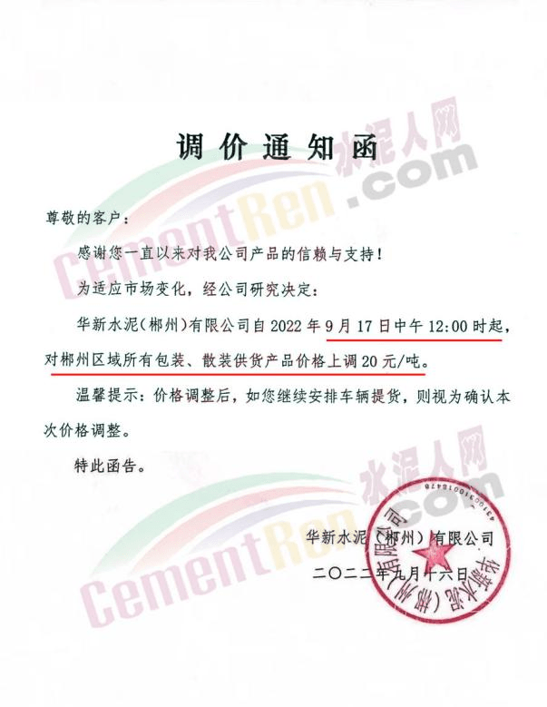 華新水泥(郴州)有限公司通知,自9月17日中午12時起對郴州區(qū)域所有包裝、散裝供貨產(chǎn)品價格上調(diào)20元/噸。