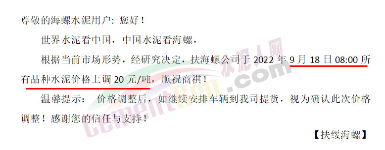 廣西扶綏海螺通知9月18日8時起所有品種水泥價格上調(diào)20元/噸。