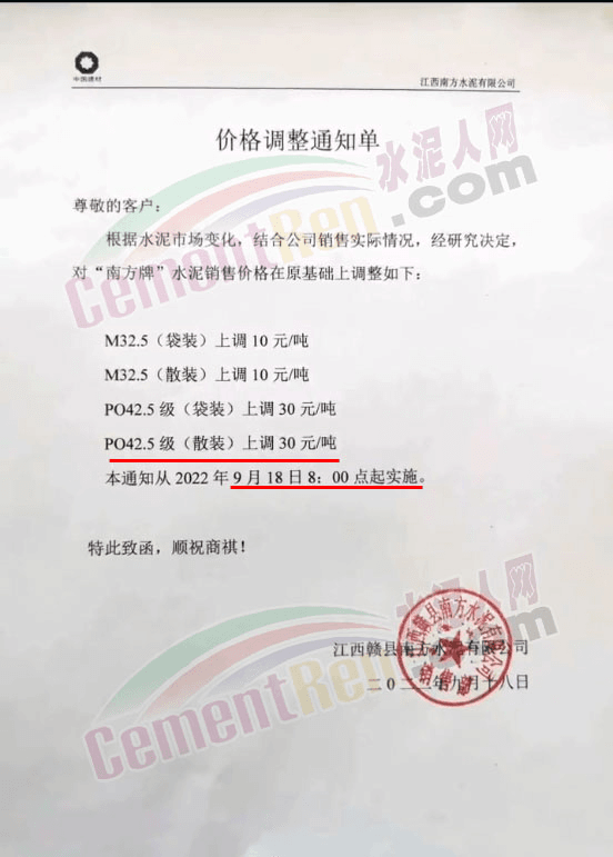 江西贛縣南方水泥有限公司通知自9月18號8點起南方32.5水泥上調(diào)10元/噸,42.5水泥上調(diào)30元/噸。