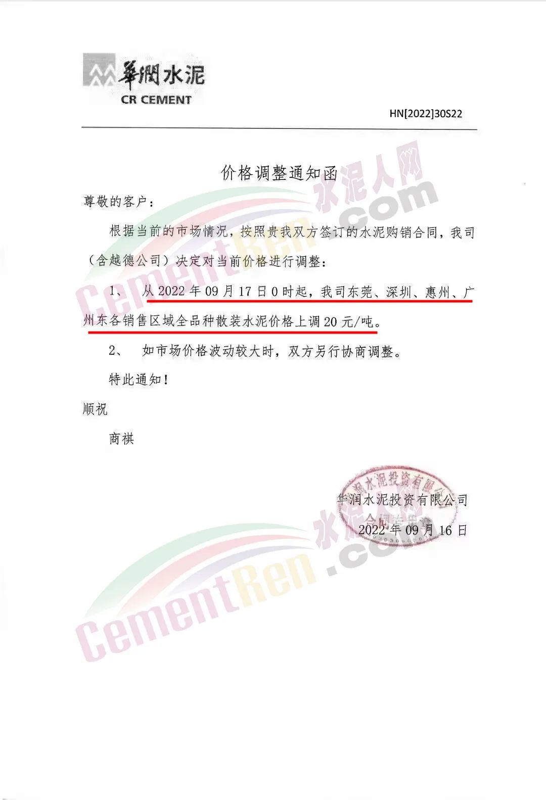 廣西貴港華潤平南水泥有限公司通知9月20日0時起,對發(fā)平南區(qū)域袋裝、散裝各品種水泥出廠價上調(diào)10元/噸。