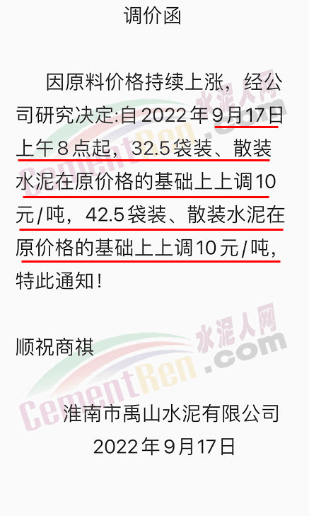 淮南市禹山水泥有限公司通知因原料價格持續(xù)上漲,經(jīng)公司研究決定∶自9月17日上午8點起,32.5袋裝、散裝水泥在原價格的基礎(chǔ)上上調(diào)10 元/噸,42.5袋裝、散裝水泥在原價格的基礎(chǔ)上上調(diào)10元/噸。