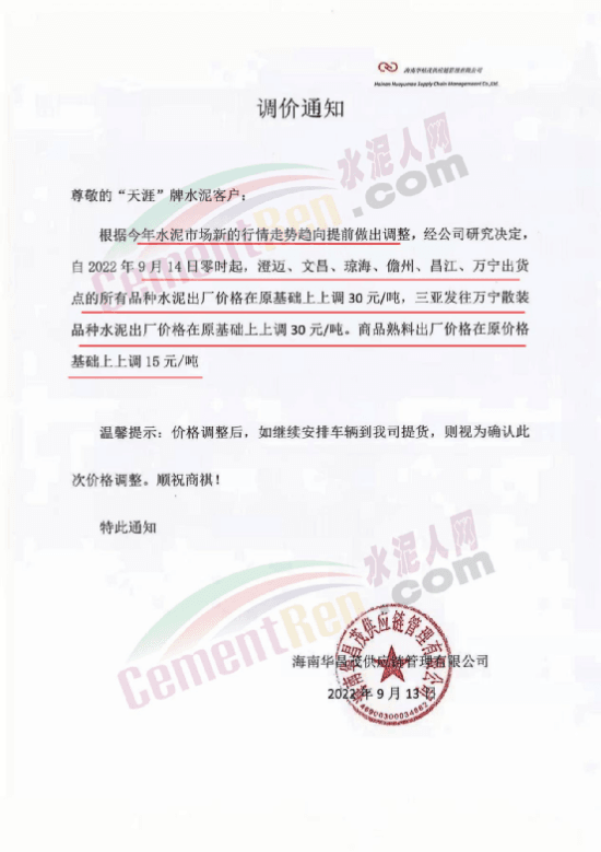 海南華昌茂供應(yīng)鏈管理有限公司、海南華裕茂供應(yīng)鏈管理有限公司通知,根據(jù)今年水泥市場新的行情走勢趨向提前做出調(diào)整,經(jīng)公司研究決定,自2022年9月14日零時起,澄邁、文昌、瓊海、儋州、昌江、萬寧出貨點的所有品種水泥出廠價格在原基礎(chǔ)上上調(diào)30元/噸,三亞發(fā)往萬寧散裝品種水泥出廠價格在原基礎(chǔ)上上調(diào)30元/噸。商品熟料出廠價格在原價格基礎(chǔ)上上調(diào)15元/噸。