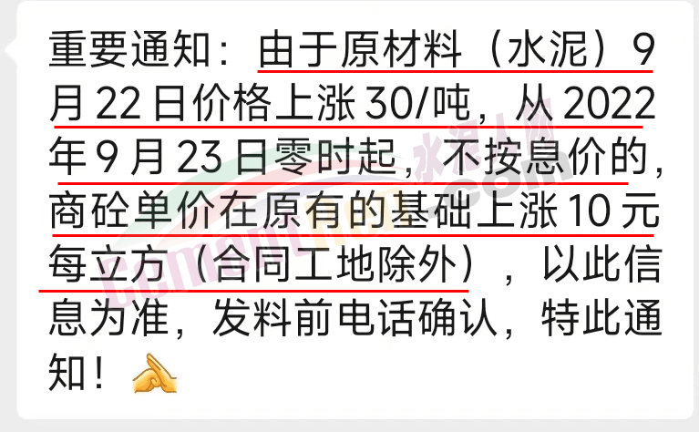 同時,下游商砼企業(yè)發(fā)重要通知稱,由于原材料(水泥)9月22日價格上漲30/噸,從2022年9月23日零時起,不按息價的,商砼單價在原有的基礎(chǔ)上漲10元每立方(合同工地除外), 發(fā)料前電話確認 。