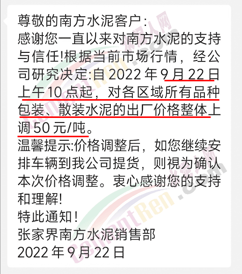 張家界南方水泥銷售部通知,經(jīng)公司研究決定自2022年9月22日上午10點起,對各區(qū)域所有品種包裝、散裝水泥的出廠價格整體上調(diào)50元/噸。