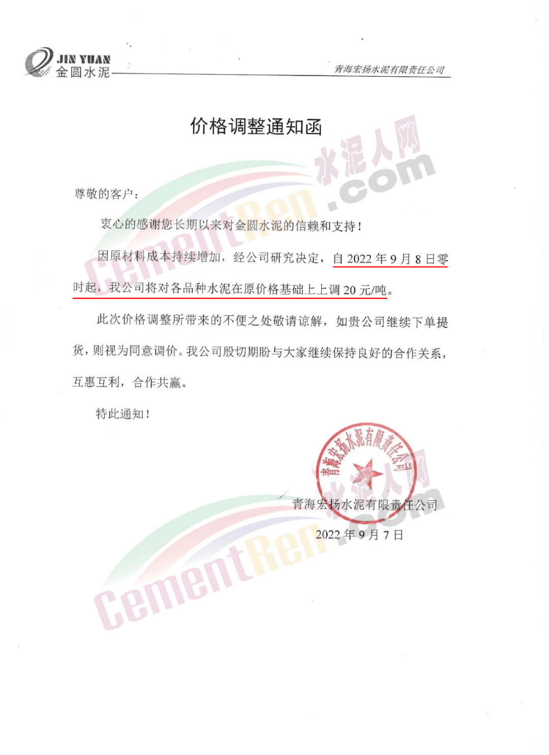 同期,區(qū)域內(nèi)海螺水泥通知自2022年9月21日中午12:00起對各區(qū)域各市場客戶,PC42.5包裝水泥和M32.5包裝水泥均上調(diào)50元/噸。