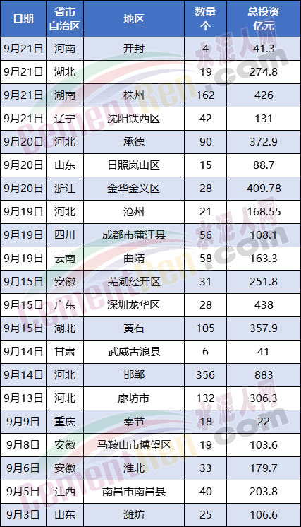 據(jù)水泥人網(wǎng)不完全統(tǒng)計,9月5日至今,浙江、安徽、河北、河南、遼寧、山東、廣東、湖北、湖南、江西、四川、重慶、云南、甘肅等14個省市自治區(qū),新開工重點項目共1288個,總投資合計5078.13億元。