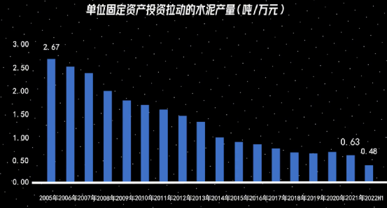 這一結(jié)論我們可以用一個(gè)指標(biāo)來(lái)驗(yàn)證,單位固定投資產(chǎn)投資拉動(dòng)的水泥產(chǎn)量。從歷史數(shù)據(jù)來(lái)看,每萬(wàn)元固定資產(chǎn)投資需要的水泥量,已經(jīng)從2005年的2.67噸下降至2021年的0.63噸。并且2022年上半年繼續(xù)下滑至0.48噸,這一遞減規(guī)律也是符合常理的。