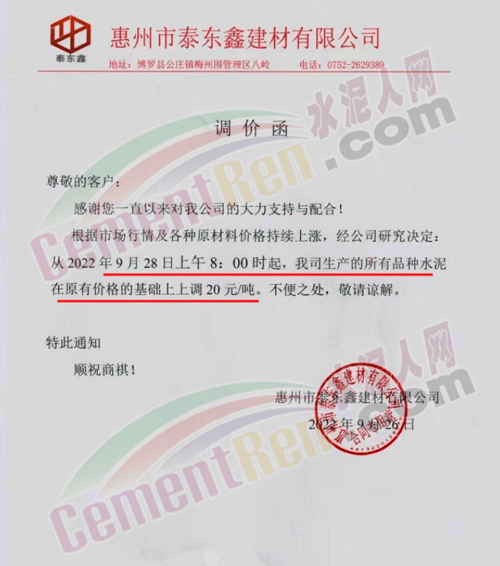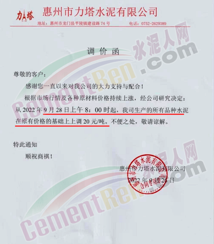 河源市金杰旋窯水泥有限公司通知鑒于市場(chǎng)行情的變動(dòng),經(jīng)公司研究決定自2022年09月27日零時(shí)起公司生產(chǎn)的所有標(biāo)號(hào)袋裝水泥、散裝水泥單價(jià)在原來(lái)的基礎(chǔ)上每噸上調(diào)20元。
