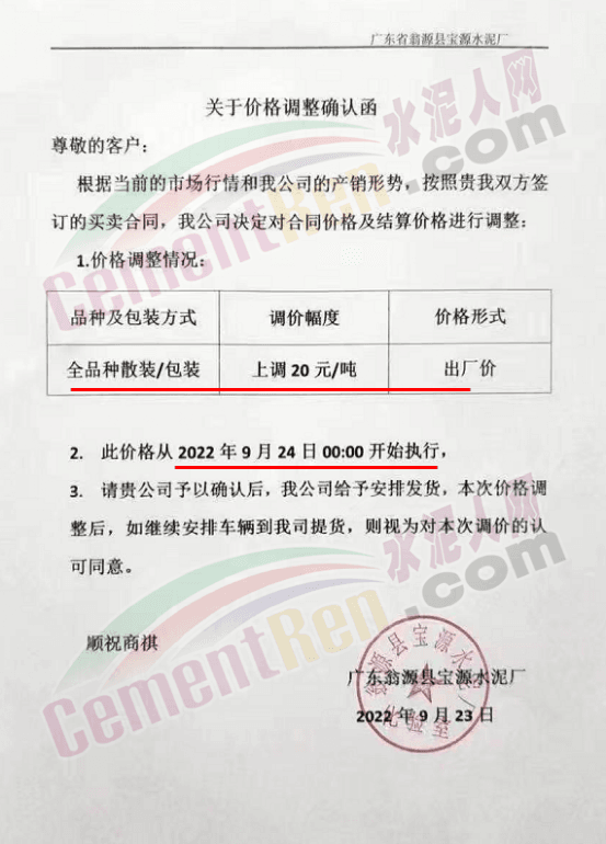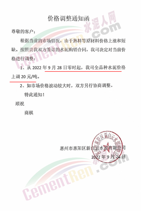 博羅縣園洲羅浮山水泥通知,9月27日8時(shí)起,水泥價(jià)格上調(diào)20元/噸。