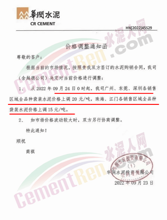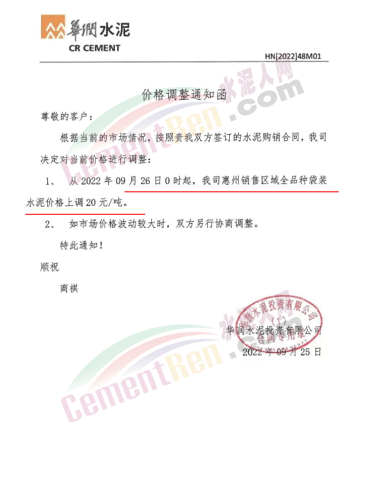 華潤(rùn)水泥通知26日0時(shí)起,惠州區(qū)域全品種袋裝水泥上調(diào)20元/噸,24日起,廣州、東莞、深圳全品種袋裝水泥上調(diào)20元/噸,珠海、江門(mén)全品種袋裝水泥上調(diào)15元/噸。