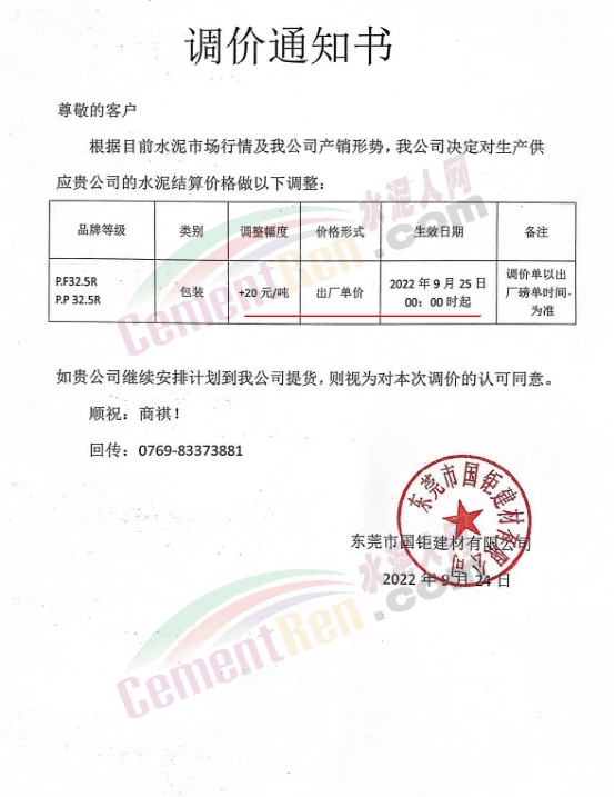 東莞市國(guó)鉅建材有限公司通知,9月25日0時(shí)起上調(diào)水泥價(jià)格20元/噸。