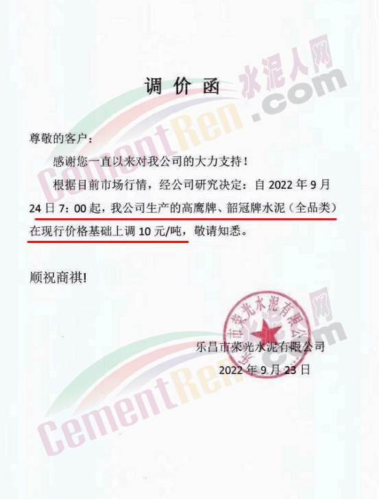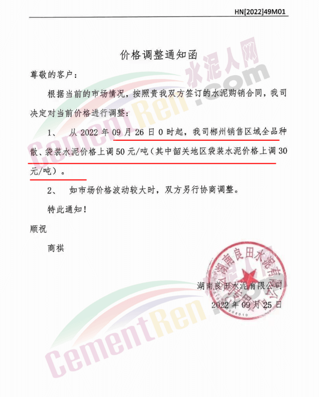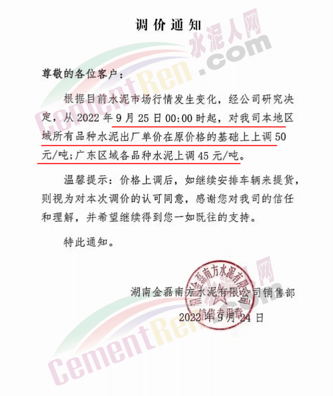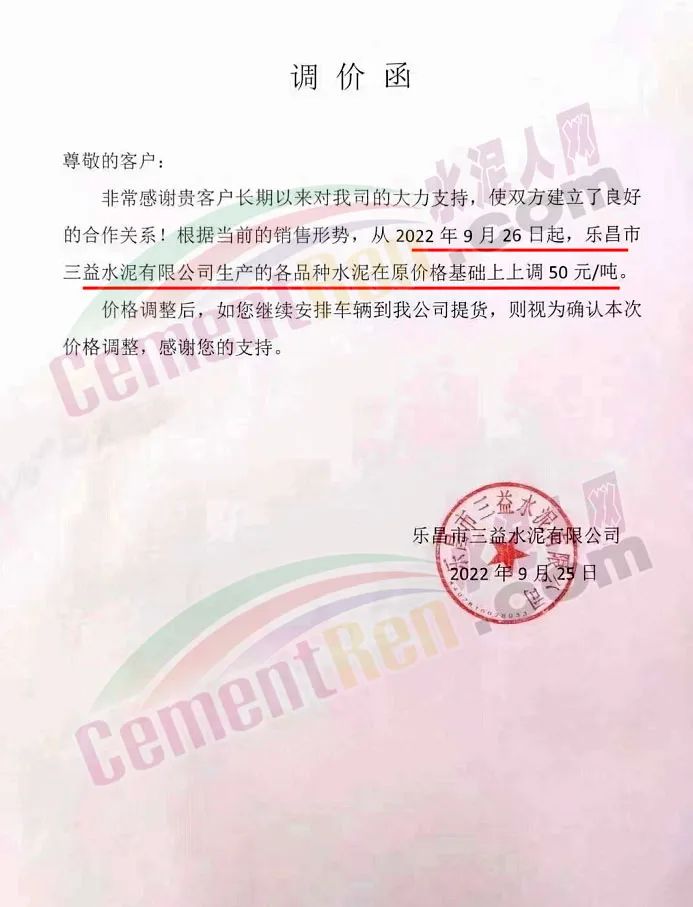 樂(lè)昌市三益水泥有限公司通知,自9月26日起,上調(diào)水泥價(jià)格50元/噸。