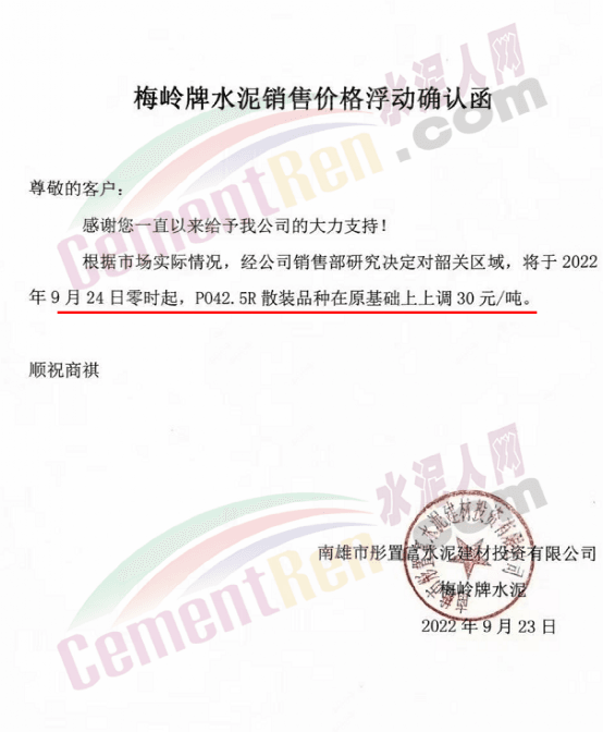 南雄市彤置富水泥建材投資有限公司通知9月24日起,P.O42.5散裝水泥上調(diào)30元/噸。