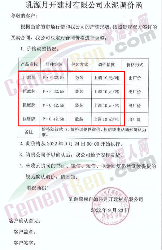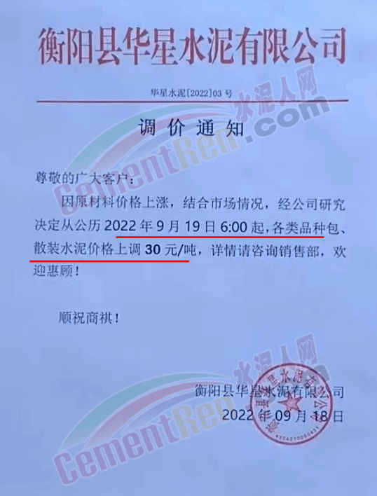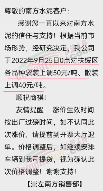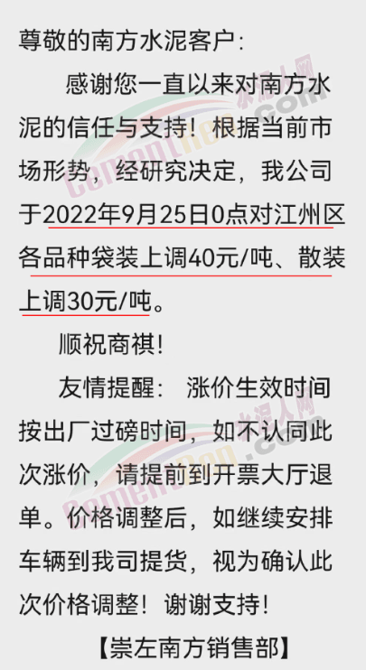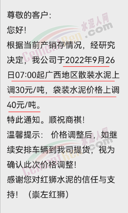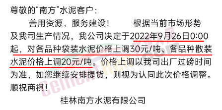 桂林南方水泥有限公司通知, 根據(jù)當(dāng)前市場(chǎng)形勢(shì)及我司生產(chǎn)情況,公司決定于2022年9月26日0:00起,對(duì)各品種袋裝水泥價(jià)格上調(diào)30元/噸、各品種散裝水泥價(jià)格上調(diào)20元/噸。
