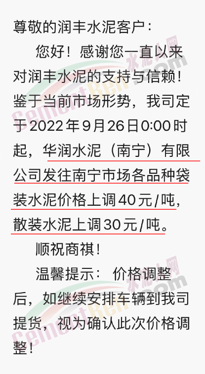 華潤(rùn)水泥(南寧)公司通知,自9月26日起發(fā)往南寧市場(chǎng)袋裝水泥上調(diào)40元/噸,散裝水泥上調(diào)30元/噸。