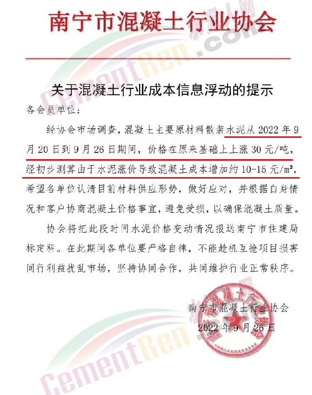 南寧市混凝土協(xié)會(huì)發(fā)提示函稱(chēng),水泥價(jià)格上漲30元/噸,混凝土成本增加約10-15元/立方,希望各單位做好應(yīng)對(duì)。