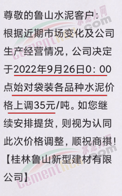 桂林魯山新型建材有限公司自9月26日0時(shí)起,對(duì)袋裝水泥價(jià)格上調(diào)35元/噸。