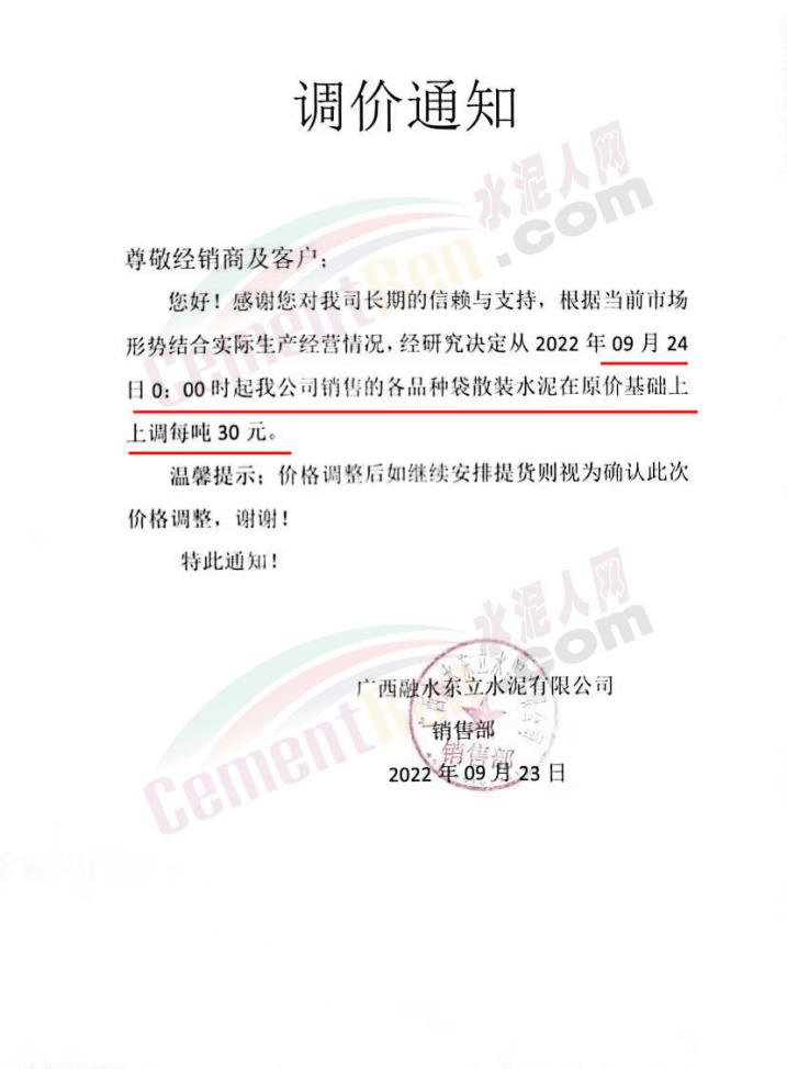 廣西融水東立水泥有限公司銷(xiāo)售部通知,自9月24日0時(shí)起,公司銷(xiāo)售的各品種水泥在原價(jià)基礎(chǔ)上上調(diào)30元/噸。