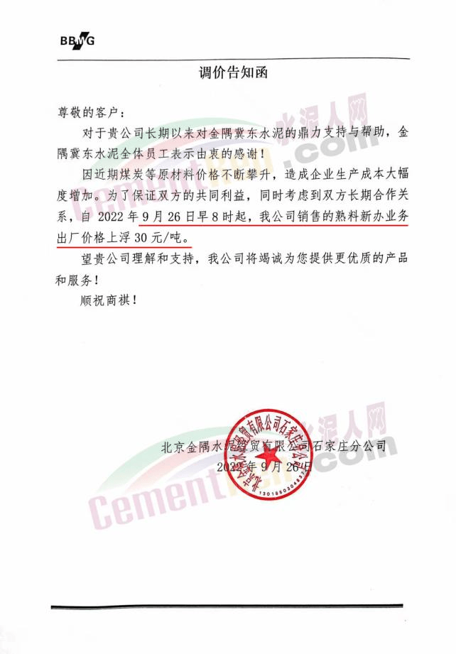 北京金隅水泥經(jīng)貿(mào)有限公司石家莊分公司通知,因近期煤炭等原材料 價(jià)格不斷攀升,造成企業(yè)生產(chǎn)成本大幅度增加。考慮到雙方長(zhǎng)期合作關(guān)系,9月26日早8時(shí)起,公司銷(xiāo)售的熟料新辦業(yè)務(wù)出廠(chǎng)價(jià)上浮30元/噸。