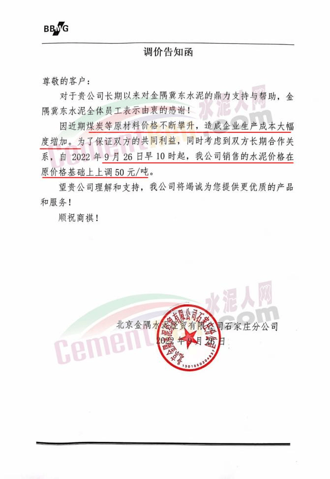 北京金隅水泥有限公司石家莊分公司通知,因近期煤炭等原料價(jià)格不斷攀升,造成企業(yè)生產(chǎn)成本大幅度增加。自9月26日早10時(shí)起,公司銷(xiāo)售的水泥價(jià)格在原基礎(chǔ)上上調(diào)50元/噸。