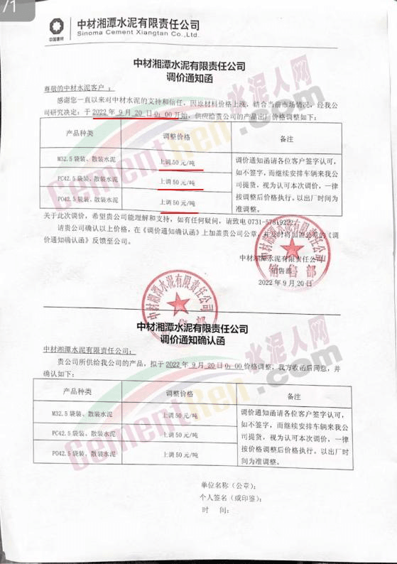 雙峰海螺水泥通知自2022年 9月26日8:00起,對(duì)各品種水泥的掛牌出廠(chǎng)價(jià)格上調(diào)30元/噸。