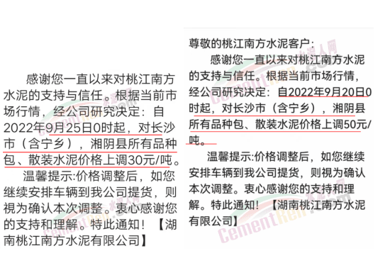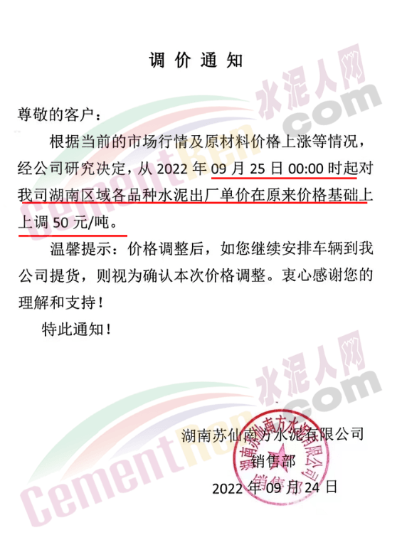 瀏陽(yáng)南方水泥通知25日起上調(diào)30元/噸,