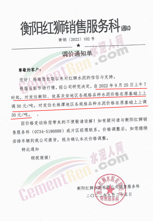衡陽(yáng)紅獅銷(xiāo)售服務(wù)科通知,9月25日上午7時(shí)起,對(duì)發(fā)往衡陽(yáng)、攸茶炎安地區(qū)水泥價(jià)格上調(diào)50元/噸,對(duì)發(fā)往長(zhǎng)株潭地區(qū)水泥價(jià)格上調(diào)30元/噸。