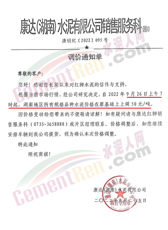 永州紅獅通知,9月25日上午7時(shí)起,各規(guī)格水泥上調(diào)50元/噸。