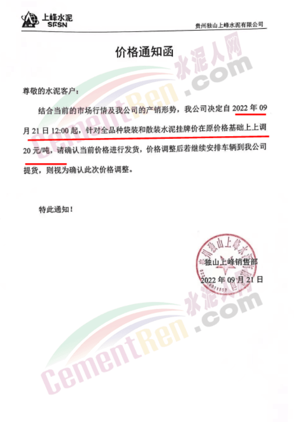 貴州獨(dú)山上峰水泥有限公司通知結(jié)合當(dāng)前的市場(chǎng)行情及公司的產(chǎn)銷(xiāo)形勢(shì),決定自2022年09月21日12:00起,針對(duì)全品種袋裝和散裝水泥掛牌價(jià)在原價(jià)格基礎(chǔ)上上調(diào)20元/噸。