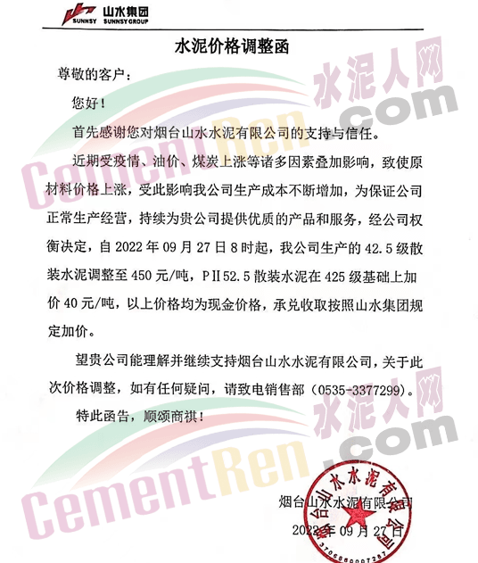 煙臺山水水泥有限公司發(fā)布通知稱:近期受疫情、油價(jià)、煤炭上漲等諸多因素疊加影響,致原材料價(jià)格上漲,受此影響,我公司生產(chǎn)成本不斷增加,為保證公司正常生產(chǎn)經(jīng)營,經(jīng)公司權(quán)衡決定,自2022年9月27日8時起,我公司生產(chǎn)的42.5級散裝水泥調(diào)至450元/噸,PII52.5散裝水泥在425級基礎(chǔ)上加價(jià)40元/噸。