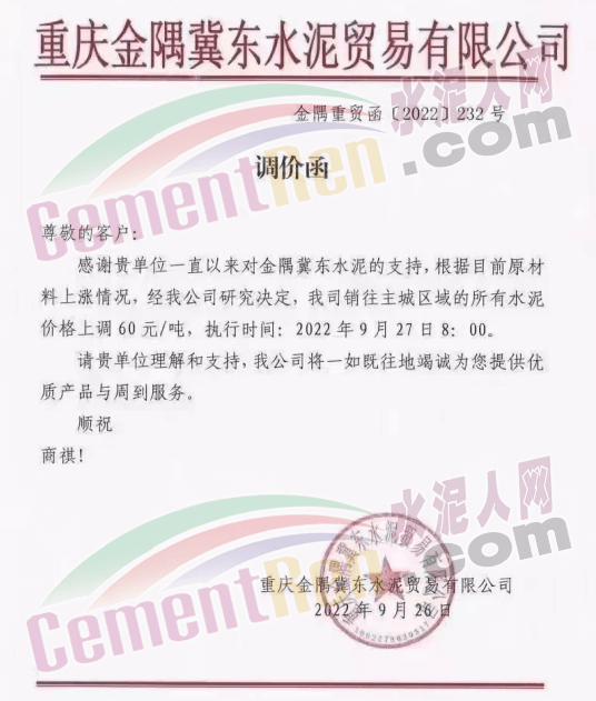重慶金隅冀東水泥貿(mào)易有限公司發(fā)布通知稱:根據(jù)目前原材料上漲情況,自2022年9月27日8時起,我司銷往主城區(qū)的所有水泥價(jià)格上調(diào)60元/噸。