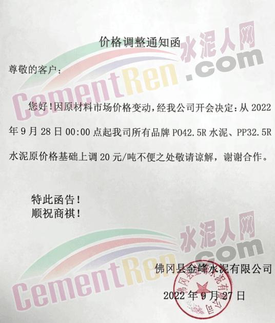 佛岡縣金峰水泥有限公司發(fā)布通知稱:因原材料市場價(jià)格變動,從2022年9月28日00:00起,我司所有品牌PO42.5R水泥、PP32.5R水泥原價(jià)格基礎(chǔ)上上調(diào)20元/噸。