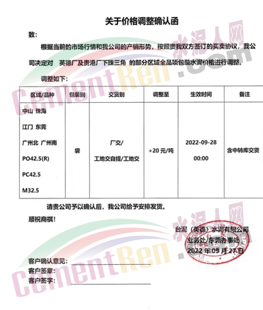 臺泥(英德)水泥有限公司發(fā)布通知稱:自2022年9月28日0時起,銷往中山、珠海、江門、東莞、廣州北、廣州南PO42.5R、PC42.5、M32.5袋裝水泥價(jià)格上調(diào)20元/噸。