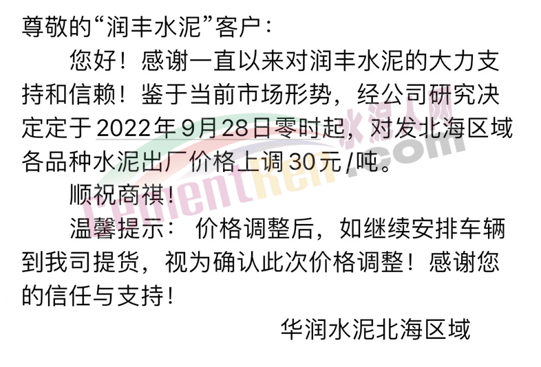 華潤水泥北海區(qū)域發(fā)布通知稱:自2022年9月28日零時起,對發(fā)北海區(qū)域各品種水泥出廠價(jià)格上調(diào)30元/噸。