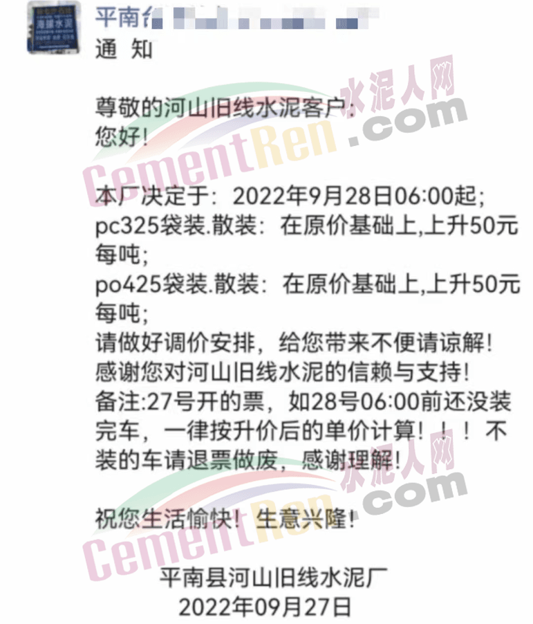 平南縣河山舊線水泥廠發(fā)布通知稱,自2022年9月28日6時起,PC32.5袋裝、散裝、PO42.5袋裝、散裝水泥在原價(jià)基礎(chǔ)上上調(diào)50元/噸。