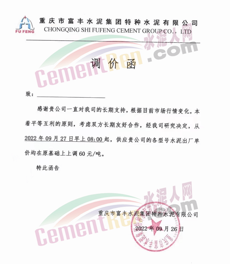 重慶市富豐水泥集團(tuán)特種水泥有限公司發(fā)布通知稱:根據(jù)目前市場行情變化,經(jīng)我司研究決定,從2022年9月27日早上8:00起,供應(yīng)貴公司各型號水泥出廠價(jià)格在原基礎(chǔ)上上調(diào)60元/噸。