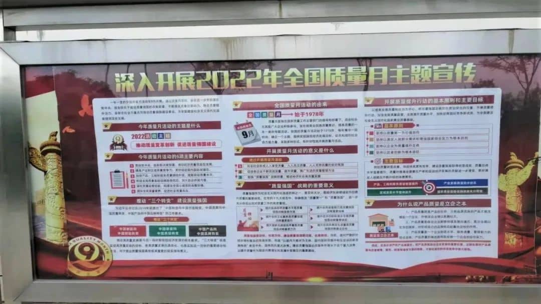 為加大“質(zhì)量月”的宣傳力度,營(yíng)造濃厚的質(zhì)量月氛圍,區(qū)域所屬各公司充分利用電子屏、宣傳欄、宣傳海報(bào)等形式,在廠區(qū)重點(diǎn)區(qū)域懸掛橫幅,利用顯示屏循環(huán)播放質(zhì)量活動(dòng)月相關(guān)宣傳視頻,生產(chǎn)現(xiàn)場(chǎng)設(shè)立宣傳展板,向職工發(fā)放宣傳資料,不斷加大宣傳力度,營(yíng)造人人知曉的宣傳氛圍,全方位對(duì)職工進(jìn)行覆蓋式質(zhì)量意識(shí)教育,為公司高質(zhì)量發(fā)展夯實(shí)基礎(chǔ)。