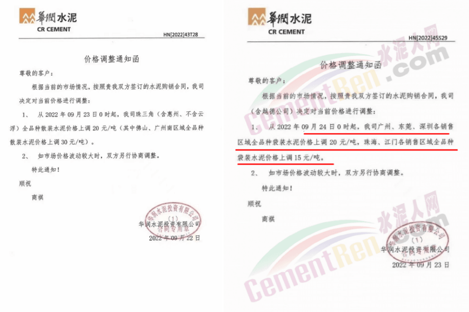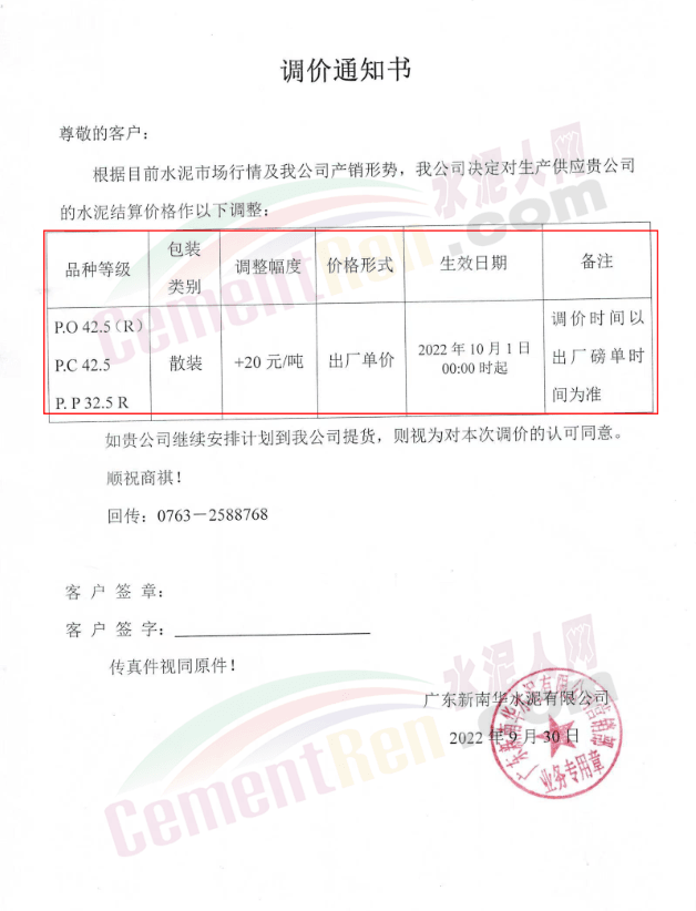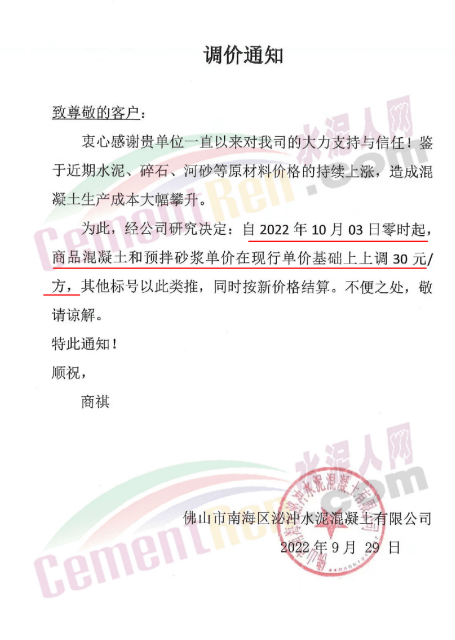 水泥人網(wǎng)通訊員消息:日前,廣東佛山市南海建源混凝土有限公司、佛山市南海區(qū)泌沖水泥混凝土有限公司等企業(yè)通知,鑒于近期水泥、碎石、河砂等原材料價(jià)格的持續(xù)上漲,造成混凝土生產(chǎn)成本大幅攀升。經(jīng)公司研究決定,自2022年10月3日零時(shí)起,商品混凝土和預(yù)拌砂漿價(jià)格上調(diào)30元/方,其他標(biāo)號(hào)以此類推,同時(shí)按新價(jià)格結(jié)算。