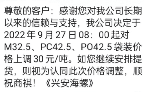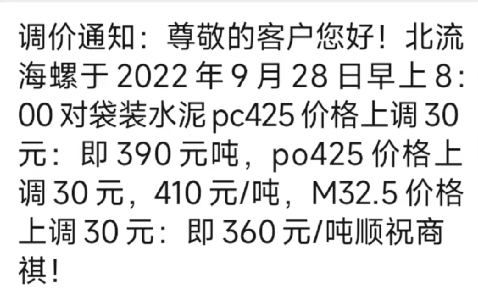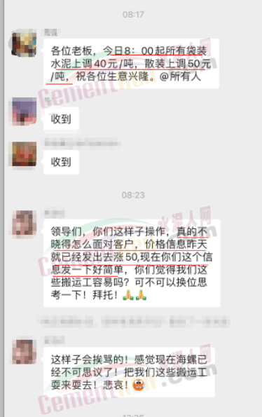 海螺水泥經(jīng)銷商打款群里通知調(diào)價(jià)的信息是在8點(diǎn)17分,通知是自8點(diǎn)起上調(diào)40-50元/噸。前一日司機(jī)群里的通知是“25日8時(shí)上調(diào)50元/噸,后經(jīng)研討決定,改為26日8點(diǎn)各品種上調(diào)30元/噸。”