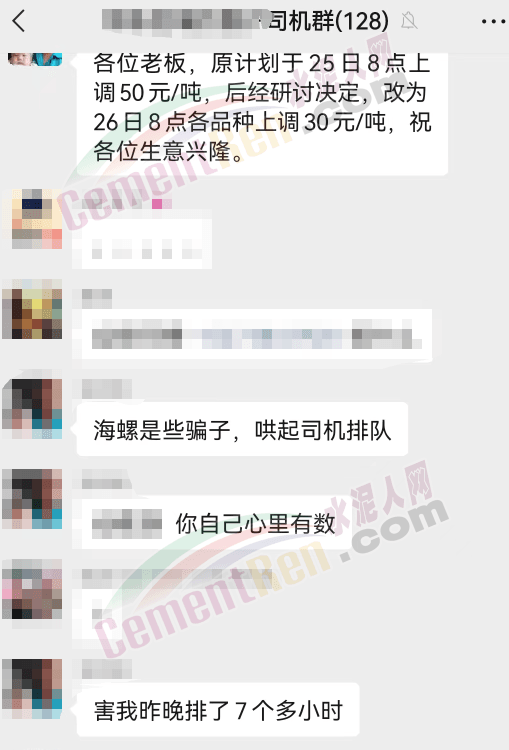 近來多區(qū)域水泥價(jià)格上漲,個(gè)別企業(yè)的營(yíng)銷政策變動(dòng)較大,下游經(jīng)銷商和司機(jī)多有抱怨。有司機(jī)在群里說:“海螺是騙子,害我排了7個(gè)多小時(shí)。 ”