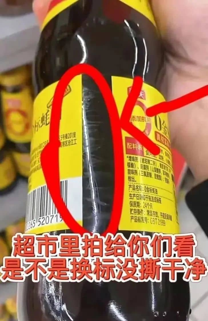 我們可以看到這瓶海天蠔油瓶子上,明顯有著原來的舊標簽,而且還有著大量的膠水。海天這一招改頭換面,是不是有些“此地無銀三百兩”了。這不是明擺著告訴別人,海天里面的配料還是原來的配料,只是外面的標簽換了而已。這不是掩耳盜鈴,自欺欺人嗎?