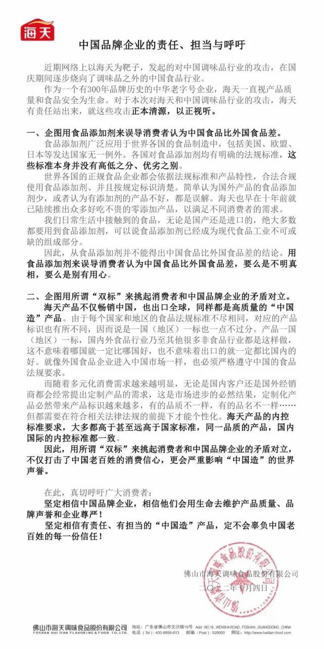 10月4日,海天味業(yè)在其微信公眾號再次發(fā)文表示,食品添加劑廣泛應用于世界各國的食品制造中,各國對食品添加劑均有明確的法規(guī)標準,這些標準本身沒有高低之分、優(yōu)劣之別。“世界各國的正規(guī)食品企業(yè)都會依據(jù)法規(guī)標準和產品特性,合法合規(guī)使用食品添加劑,并且按規(guī)定標識清楚。”