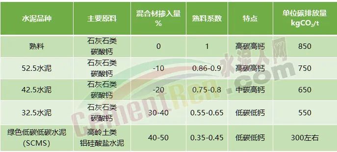 上述表格中列出的綠色低碳低鈣水泥,強度等級是32.5,特點是低碳低鈣低熟料系數,國際上統(tǒng)稱為新型低碳膠凝材料Supplementary Cementitious Materials (SCMs),直譯為補充型水泥質材料。