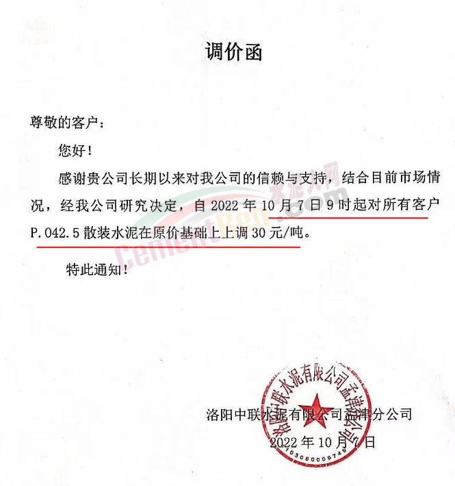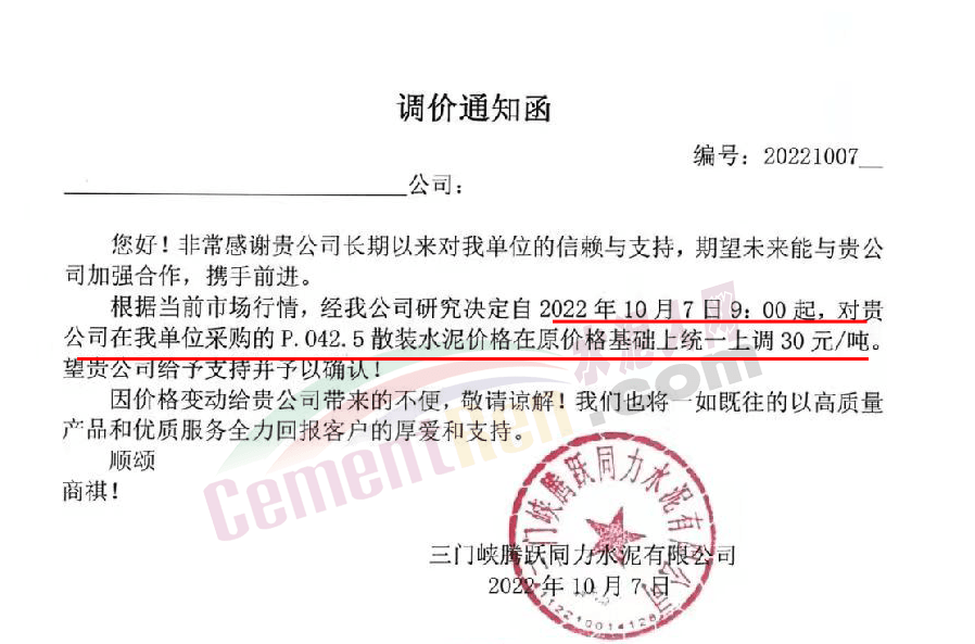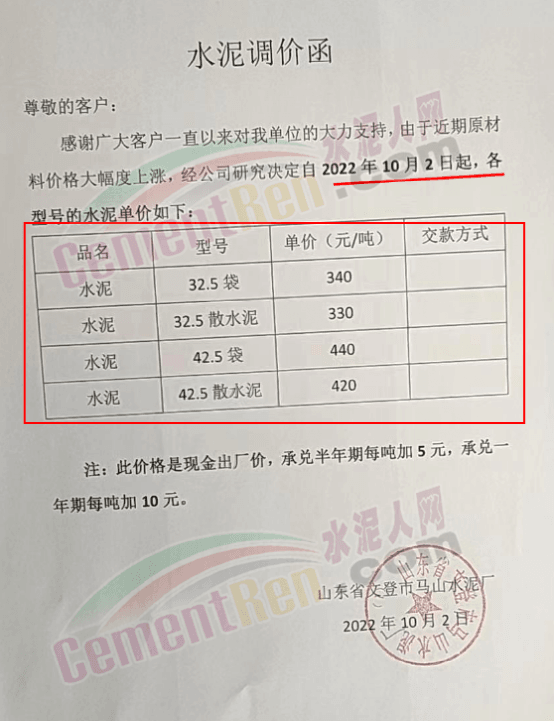 文登市小觀水泥有限公司價格調整函稱,近期受疫情、油價、原材料價格上漲等因素影響,導致水泥生產成本不斷增加,為保證公司正常生產經(jīng)營,經(jīng)公司綜合權衡決定,自2022年10月1日上午8時起,公司42.5級袋裝水泥價格調整至含稅440元/噸,42.5級散裝水泥價格調整至含稅420元/噸,32.5R級袋裝含稅360元/噸,32.5R級散裝350元/噸,32.5級袋裝含稅340元/噸,32.5級散裝330元/噸,以上價格為現(xiàn)金價,承兌半年每噸加5元,承兌一年每噸加8元。